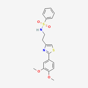 N-(2-(2-(3,4-dimethoxyphenyl)thiazol-4-yl)ethyl)benzenesulfonamide is a complex organic compound featuring a thiazole ring, a benzenesulfonamide group, and a dimethoxyphenyl moiety. Thiazole derivatives are known for their diverse biological activities, including antibacterial, antifungal, anti-inflammatory, and antitumor properties .
