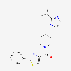 The compound “(4-((2-isopropyl-1H-imidazol-1-yl)methyl)piperidin-1-yl)(2-phenylthiazol-4-yl)methanone” is a heterocyclic small molecule featuring a piperidine scaffold linked to a 2-phenylthiazole moiety via a methanone bridge. Its structure incorporates a 2-isopropylimidazole group, which is critical for interactions with biological targets such as kinases or receptors. The molecule’s complexity arises from the strategic placement of aromatic and aliphatic substituents, which influence its solubility, bioavailability, and binding affinity.