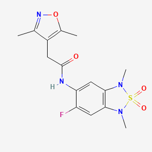 The synthesis of 2-(3,5-dimethyl-1,2-oxazol-4-yl)-N-(6-fluoro-1,3-dimethyl-2,2-dioxo-1,3-dihydro-2lambda6,1,3-benzothiadiazol-5-yl)acetamide typically involves multiple steps, starting from commercially available precursors. One common synthetic route includes the following steps: