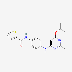 The synthesis of N-(4-((6-isopropoxy-2-methylpyrimidin-4-yl)amino)phenyl)thiophene-2-carboxamide typically involves multiple steps, starting with the preparation of the pyrimidine ring, followed by the introduction of the isopropoxy and methyl groups. The phenyl group is then attached to the pyrimidine ring through an amination reaction. Finally, the thiophene-2-carboxamide moiety is introduced via a coupling reaction.