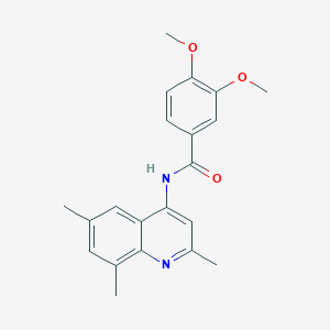 The synthesis of 3,4-dimethoxy-N-(2,6,8-trimethylquinolin-4-yl)benzamide typically involves starting materials such as 3,4-dimethoxybenzoic acid and 2,6,8-trimethylquinoline. The reaction is carried out under specific conditions using reagents like triethylamine (TEA) as a base and tetrahydrofuran (THF) as a solvent. The yields of the product can vary depending on the reaction conditions, but they are generally in the range of 40-72% .