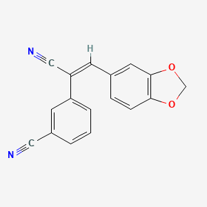 The synthesis of 3-[(E)-2-(1,3-benzodioxol-5-yl)-1-cyanoethenyl]benzonitrile typically involves a multi-step process. One common method starts with the preparation of the benzodioxole intermediate, which is then subjected to a Knoevenagel condensation reaction with a suitable aldehyde and a cyano group donor. The reaction conditions often include the use of a base such as piperidine or pyridine and a solvent like ethanol or methanol. The reaction is usually carried out under reflux conditions to ensure complete conversion of the starting materials .