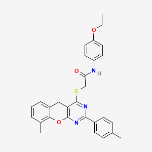N-(4-Ethoxyphenyl)-2-{[9-Methyl-2-(4-Methylphenyl)-5H-Chromeno[2,3-D]Pyrimidin-4-YL]Sulfanyl}Acetamide is a complex organic compound characterized by a chromeno-pyrimidine backbone with an ethoxyphenyl and a methyl group substitution. Its structure suggests potential interactions with biological targets due to the presence of functional groups that can participate in hydrogen bonding and π-π stacking interactions.