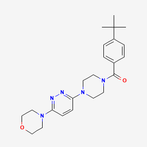 The compound 4-{6-[4-(4-tert-butylbenzoyl)piperazin-1-yl]pyridazin-3-yl}morpholine is a pyridazine derivative featuring a morpholine moiety and a piperazine group substituted with a bulky 4-tert-butylbenzoyl aromatic group. Its design combines a pyridazine core—a heterocyclic scaffold known for hydrogen-bonding interactions—with substituents that may influence lipophilicity, solubility, and target binding.