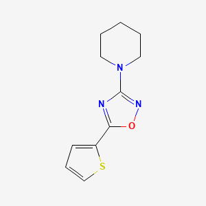 The synthesis of 1-[5-(thiophen-2-yl)-1,2,4-oxadiazol-3-yl]piperidine typically involves the cyclization of appropriate precursors. One common method involves the reaction of a thiophene carboxylic acid hydrazide with a piperidine derivative in the presence of a dehydrating agent such as phosphorus oxychloride. The reaction is carried out under reflux conditions to facilitate the formation of the oxadiazole ring.