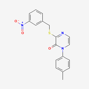 This compound belongs to the dihydropyrazin-2-one class, characterized by a six-membered pyrazine ring with one oxygen substituent and a partially reduced structure. The molecule features a 4-methylphenyl group at position 1 and a sulfanyl-linked 3-nitrophenylmethyl substituent at position 2. The nitro group confers electron-withdrawing properties, while the methyl group enhances lipophilicity.