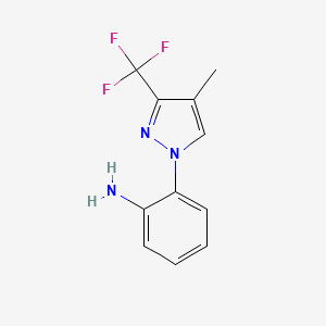 The mechanism of action of 2-[4-Methyl-3-(trifluoromethyl)-1H-pyrazol-1-yl]aniline involves its interaction with specific molecular targets and pathways. The trifluoromethyl group enhances the compound’s lipophilicity, allowing it to easily penetrate cell membranes and interact with intracellular targets. The pyrazole ring can bind to various enzymes and receptors, modulating their activity and leading to the desired biological effects.