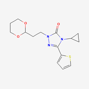 This compound belongs to the 1,2,4-triazol-5(4H)-one class, characterized by a central triazolone core substituted with a thiophen-2-yl group, a cyclopropyl moiety, and a 1,3-dioxane-containing ethyl chain. The 1,3-dioxane substituent likely improves aqueous solubility compared to purely hydrophobic analogs .
