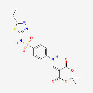 This compound is a sulfonamide derivative featuring a 1,3,4-thiadiazole ring substituted with an ethyl group at position 5 and a benzenesulfonamide moiety modified by a (2,2-dimethyl-4,6-dioxo-1,3-dioxan-5-ylidene)methylamino group. Such derivatives are often synthesized via Schotten-Baumann or condensation reactions, as seen in analogous compounds .