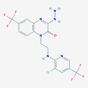 This quinoxalinone derivative features a complex structure with distinct functional groups: a 3-hydrazino substituent, 6-trifluoromethyl group, and a 1-(2-{[3-chloro-5-(trifluoromethyl)-2-pyridinyl]amino}ethyl) side chain. The quinoxalinone core is a bicyclic heteroaromatic system known for diverse bioactivities, including enzyme inhibition and antimicrobial effects . The trifluoromethyl groups at positions 6 (quinoxalinone) and 5 (pyridine) likely improve metabolic stability and lipophilicity, critical for pharmacokinetics .