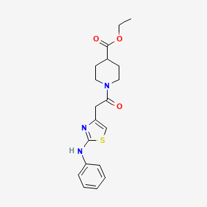 The mechanism of action of Ethyl 1-(2-(2-(phenylamino)thiazol-4-yl)acetyl)piperidine-4-carboxylate involves its interaction with various molecular targets. The thiazole ring can interact with enzymes and receptors, potentially inhibiting their activity. This compound may also interfere with DNA synthesis and repair mechanisms, leading to its anticancer effects. The exact pathways and molecular targets are still under investigation, but it is believed to involve inhibition of key enzymes in metabolic pathways.