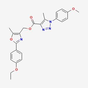 The compound [2-(4-ethoxyphenyl)-5-methyl-1,3-oxazol-4-yl]methyl 1-(4-methoxyphenyl)-5-methyl-1H-1,2,3-triazole-4-carboxylate is a heterocyclic hybrid molecule combining a 1,3-oxazole and 1,2,3-triazole scaffold. Its structure features a 1,3-oxazole ring substituted with a 4-ethoxyphenyl group at position 2 and a methyl group at position 4. This oxazole moiety is esterified to a 1,2,3-triazole-4-carboxylate group, which is further substituted with a 4-methoxyphenyl group at position 1 and a methyl group at position 5.