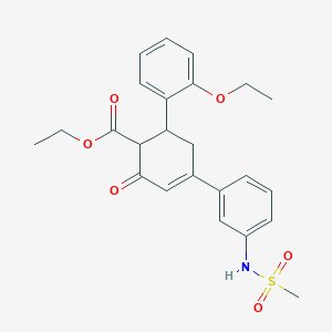 Recent studies have explored the potential of this compound as an anticancer agent. The structural features of ethyl 6-(2-ethoxyphenyl)-4-(3-methanesulfonamidophenyl)-2-oxocyclohex-3-ene-1-carboxylate suggest that it may interact with specific biological targets involved in cancer cell proliferation. For instance, its ability to inhibit certain enzymes linked to tumor growth has been documented in preliminary research, indicating a pathway for further investigation into its efficacy as a therapeutic agent against various cancers.