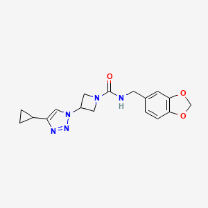 The mechanism of action of N-[(2H-1,3-benzodioxol-5-yl)methyl]-3-(4-cyclopropyl-1H-1,2,3-triazol-1-yl)azetidine-1-carboxamide is not fully understood. it is believed to interact with specific molecular targets, such as enzymes or receptors, through its unique functional groups. The benzo[d][1,3]dioxole moiety may interact with hydrophobic pockets, while the triazole ring can participate in hydrogen bonding or π-π interactions. The azetidine ring may provide additional binding affinity through its conformational flexibility.
