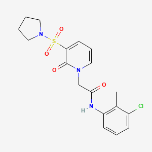 The compound features a chloro-substituted phenyl ring , a pyrrolidine sulfonyl group , and a dihydropyridinyl acetamide moiety . Its IUPAC name is N-(3-chloro-2-methylphenyl)-2-(2-oxo-3-pyrrolidin-1-ylsulfonylpyridin-1-yl)acetamide, with the molecular formula .