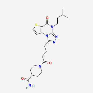 InChI=1S/C22H30N6O3S/c1-14(2)6-12-27-21(31)19-16(9-13-32-19)28-17(24-25-22(27)28)4-3-5-18(29)26-10-7-15(8-11-26)20(23)30/h9,13-15H,3-8,10-12H2,1-2H3,(H2,23,30) | |