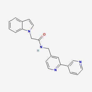 N-([2,3'-bipyridin]-4-ylmethyl)-2-(1H-indol-1-yl)acetamide is a synthetic compound that integrates the structural characteristics of bipyridine and indole. This compound has garnered interest in medicinal chemistry due to its potential biological activities, including antibacterial and antifungal properties. This article reviews the biological activity of this compound, focusing on its mechanism of action, efficacy against various pathogens, and relevant research findings.