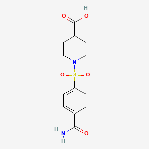 The mechanism of action of 1-(4-Carbamoylbenzenesulfonyl)piperidine-4-carboxylic acid involves its interaction with specific molecular targets. The sulfonyl group is known to interact with various enzymes, potentially inhibiting their activity. The piperidine ring can interact with receptor sites, modulating their function. The exact pathways involved depend on the specific biological context and the presence of other interacting molecules .