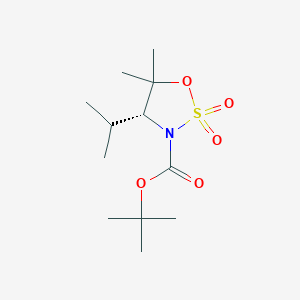 This compound is a chiral oxathiazolidine derivative featuring a tert-butyl carbamate group, a 1,2λ⁶-thiazolidine-2,2-dioxide (sultam) ring system, and stereochemical complexity at the 4-position (R-configuration). The structure includes a 5,5-dimethyl-substituted sultam ring and an isopropyl group at the 4-position. Such derivatives are often employed as intermediates in pharmaceutical synthesis due to their ability to act as chiral auxiliaries or protecting groups. The tert-butyl carbamate (Boc) group enhances solubility in organic solvents and stabilizes the molecule against premature degradation during synthetic processes .