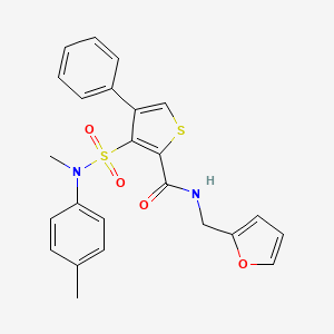 The synthesis of N-[(furan-2-yl)methyl]-3-[methyl(4-methylphenyl)sulfamoyl]-4-phenylthiophene-2-carboxamide typically involves multiple steps, including the formation of the furan and thiophene rings, followed by the introduction of the sulfonamide group. Common reagents used in these reactions include furan-2-carboxylic acid, thiophene-2-carboxylic acid, and various sulfonyl chlorides. The reactions are often carried out under controlled conditions, such as specific temperatures and pH levels, to ensure the desired product is obtained.