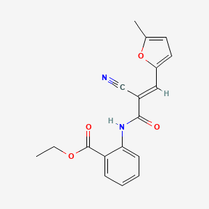 (E)-ethyl 2-(2-cyano-3-(5-methylfuran-2-yl)acrylamido)benzoate is a synthetic acrylamide derivative characterized by a benzoate ester backbone conjugated with a cyanoacrylamide group and a 5-methylfuran-2-yl substituent. This compound belongs to a broader class of acrylamides, which are widely studied for their structural versatility and biological activities, including antimicrobial, antioxidant, and anti-inflammatory properties . The (E)-stereochemistry of the acrylamide moiety is critical for maintaining planar geometry, enabling π-π stacking interactions with biological targets such as enzymes or receptors.