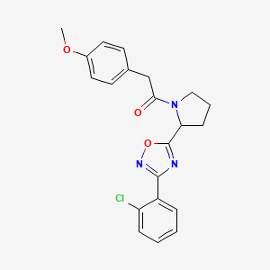 3-(2-Chlorophenyl)-5-{1-[(4-methoxyphenyl)acetyl]pyrrolidin-2-yl}-1,2,4-oxadiazole is a useful research compound. Its molecular formula is C21H20ClN3O3 and its molecular weight is 397.86. The purity is usually 95%.