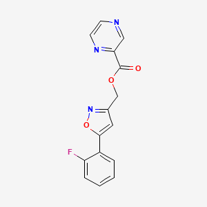 [5-(2-fluorophenyl)-1,2-oxazol-3-yl]methyl pyrazine-2-carboxylate is a compound with the molecular formula C15H10FN3O3 and a molecular weight of 299.261 g/mol. Its unique structure, which includes a fluorophenyl group, an isoxazole ring, and a pyrazine carboxylate moiety, positions it as a significant candidate for various biological activities and therapeutic applications. This article reviews its synthesis, biological properties, and potential applications based on diverse research findings.