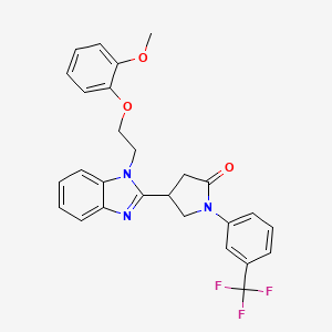 The mechanism of action of 4-{1-[2-(2-methoxyphenoxy)ethyl]-1H-1,3-benzodiazol-2-yl}-1-[3-(trifluoromethyl)phenyl]pyrrolidin-2-one involves its interaction with specific molecular targets and pathways. The benzimidazole core is known to interact with various enzymes and receptors, potentially inhibiting their activity. The trifluoromethyl group can enhance the compound’s binding affinity and stability, making it a potent inhibitor or activator of specific biological pathways.