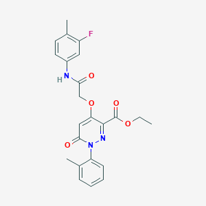 Ethyl 4-(2-((3-fluoro-4-methylphenyl)amino)-2-oxoethoxy)-6-oxo-1-(o-tolyl)-1,6-dihydropyridazine-3-carboxylate's biological activity involves interactions with biological targets such as enzymes and receptors. The presence of the fluoro-methylphenyl amino group suggests that the compound may have inhibitory effects on certain enzymes or receptors and may act as allosteric modulators or enzyme inhibitors.