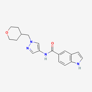 N-{1-[(Oxan-4-yl)methyl]-1H-pyrazol-4-yl}-1H-indole-5-carboxamide is a heterocyclic compound featuring a pyrazole core substituted at the 1-position with a (oxan-4-yl)methyl group and at the 4-position with an indole-5-carboxamide moiety.
