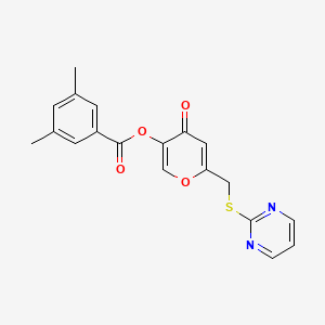 The compound 4-oxo-6-[(pyrimidin-2-ylsulfanyl)methyl]-4H-pyran-3-yl 3,5-dimethylbenzoate is a complex organic molecule that has garnered attention in medicinal chemistry due to its unique structural features and potential biological activities. This compound incorporates a pyran ring fused with a pyrimidine moiety, which suggests diverse pharmacological properties.