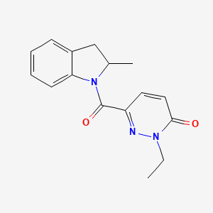 “2-ethyl-6-(2-methylindoline-1-carbonyl)pyridazin-3(2H)-one” is a pyridazinone derivative characterized by a pyridazin-3(2H)-one core substituted with an ethyl group at position 2 and a 2-methylindoline-1-carbonyl moiety at position 6. Pyridazinones are heterocyclic compounds of pharmacological interest due to their diverse biological activities, including cardiovascular, anticancer, and anti-inflammatory effects . For example, 5-chloro-6-phenylpyridazin-3(2H)-one derivatives are prepared by reacting the parent compound with halides in acetone using potassium carbonate as a base .
