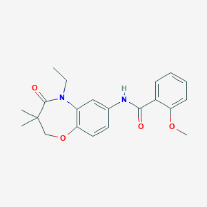 The synthesis of N-(5-ethyl-3,3-dimethyl-4-oxo-2,3,4,5-tetrahydro-1,5-benzoxazepin-7-yl)-2-methoxybenzamide typically involves multiple steps, starting from readily available starting materials. The key steps include the formation of the benzoxazepine ring system and subsequent functionalization to introduce the methoxybenzamide group. Specific reaction conditions, such as temperature, solvents, and catalysts, are optimized to achieve high yields and purity.