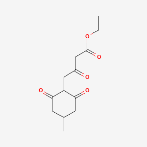 Ethyl 4-(4-methyl-2,6-dioxocyclohexyl)-3-oxobutanoate is a synthetic compound with significant potential in various biological applications. This compound, with the molecular formula and a molecular weight of approximately 254.28 g/mol, is characterized by its unique structure that includes a cyclohexane ring, an ester group, and a ketone group. The compound is noted for its versatility in organic synthesis and its promising biological activities.