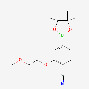 The synthesis of 2-(2-Methoxyethoxy)-4-(tetramethyl-1,3,2-dioxaborolan-2-yl)benzonitrile typically involves the coupling of a benzonitrile derivative with a boronic ester. One common method is the Suzuki-Miyaura cross-coupling reaction, which uses a palladium catalyst and a base in an organic solvent. The reaction conditions often include heating the mixture to facilitate the coupling process.