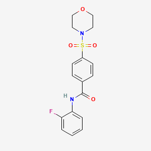 The synthesis of N-(2-fluorophenyl)-4-(morpholinosulfonyl)benzamide typically involves the reaction of 2-fluoroaniline with 4-(morpholinosulfonyl)benzoic acid. The reaction is usually carried out in the presence of a coupling agent such as N,N’-dicyclohexylcarbodiimide (DCC) and a catalyst like 4-dimethylaminopyridine (DMAP). The reaction conditions often include an inert atmosphere, such as nitrogen or argon, and a solvent like dichloromethane or tetrahydrofuran. The reaction mixture is stirred at room temperature or slightly elevated temperatures until the reaction is complete.