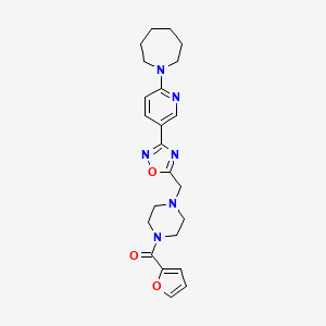 The mechanism of action of 1-[5-(5-{[4-(Furan-2-carbonyl)piperazin-1-yl]methyl}-1,2,4-oxadiazol-3-yl)pyridin-2-yl]azepane involves its interaction with specific molecular targets and pathways. The compound may bind to certain receptors or enzymes, modulating their activity and leading to various biological effects. The exact molecular targets and pathways involved depend on the specific application and context of use.