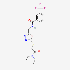 This compound belongs to the 1,3,4-oxadiazole class of heterocyclic molecules, characterized by a five-membered ring containing two nitrogen and one oxygen atom. The structure features a trifluoromethylbenzamide moiety linked to a 1,3,4-oxadiazole core substituted with a diethylcarbamoylmethylsulfanyl group. The trifluoromethyl group enhances lipophilicity and metabolic stability, while the diethylcarbamoyl moiety may influence solubility and receptor interactions .