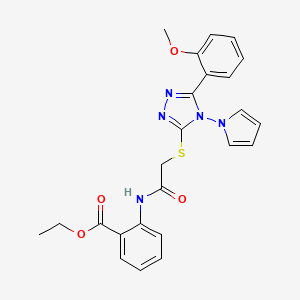 The mechanism of action of ethyl 2-(2-{[5-(2-methoxyphenyl)-4-(1H-pyrrol-1-yl)-4H-1,2,4-triazol-3-yl]sulfanyl}acetamido)benzoate involves its interaction with molecular targets such as enzymes or receptors. The compound’s various functional groups allow it to form multiple interactions, including hydrogen bonds, hydrophobic interactions, and π-π stacking. These interactions can modulate the activity of the target molecules, leading to the desired biological effects.