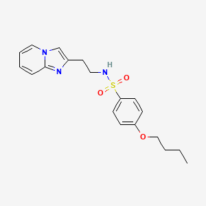 The synthesis of 4-butoxy-N-(2-{imidazo[1,2-a]pyridin-2-yl}ethyl)benzene-1-sulfonamide typically involves multiple steps, starting from readily available starting materials. One common approach involves the condensation of 2-aminopyridine with an appropriate aldehyde or ketone to form the imidazo[1,2-a]pyridine core.