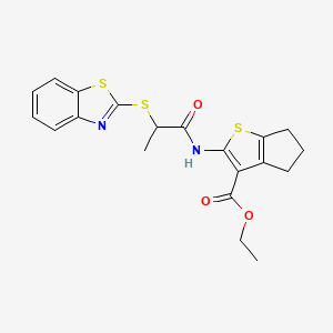 Ethyl 2-(2-(benzo[d]thiazol-2-ylthio)propanamido)-5,6-dihydro-4H-cyclopenta[b]thiophene-3-carboxylate is a heterocyclic compound featuring a fused cyclopenta[b]thiophene core substituted with an ethyl ester group at position 3 and a propanamido-linked benzo[d]thiazole-thioether moiety at position 2. This structure combines aromaticity (from the thiophene and benzothiazole rings) with conformational flexibility (from the dihydrocyclopentane ring), making it a candidate for diverse applications, including pharmaceuticals and materials science. The benzo[d]thiazole group is notable for its electron-withdrawing properties and role in medicinal chemistry, often associated with bioactivity .