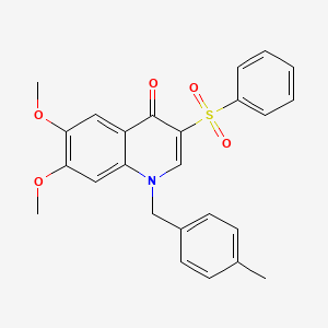 3-(Benzenesulfonyl)-6,7-dimethoxy-1-[(4-methylphenyl)methyl]quinolin-4-one is a complex organic compound belonging to the quinoline family, characterized by its diverse biological activities. This compound has garnered attention for its potential therapeutic applications, particularly in the fields of oncology and inflammatory diseases. The unique structural features of this compound, including the benzenesulfonyl and methoxy groups, enhance its interaction with biological targets.