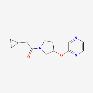 The synthesis of 2-Cyclopropyl-1-(3-(pyrazin-2-yloxy)pyrrolidin-1-yl)ethanone typically involves multiple steps One common synthetic route starts with the preparation of the pyrazin-2-yloxy intermediate, which is then coupled with a pyrrolidine derivativeReaction conditions often include the use of organic solvents, catalysts, and controlled temperatures to ensure high yields and purity .