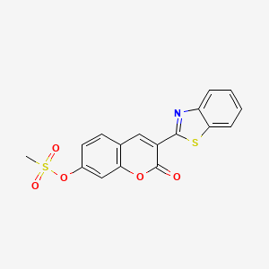 Synthetic Routes and Reaction Conditions: The synthesis of 3-(benzo[d]thiazol-2-yl)-2-oxo-2H-chromen-7-yl methanesulfonate typically involves multiple steps, starting with the construction of the benzothiazole core. One common approach is the condensation of 2-aminobenzothiazole with an appropriate aldehyde or ketone to form the chromen-2-one system. Subsequent steps may include oxidation, cyclization, and sulfonation reactions to introduce the methanesulfonate group.
