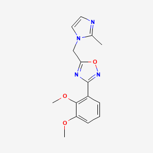 The synthesis of 3-(2,3-dimethoxyphenyl)-5-[(2-methyl-1H-imidazol-1-yl)methyl]-1,2,4-oxadiazole typically involves the cyclization of appropriate precursors under controlled conditions. One common method involves the reaction of 2,3-dimethoxybenzohydrazide with 2-methylimidazole in the presence of a dehydrating agent such as phosphorus oxychloride (POCl3) or thionyl chloride (SOCl2). The reaction is usually carried out under reflux conditions to facilitate the formation of the oxadiazole ring.