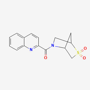 The compound (2,2-dioxido-2-thia-5-azabicyclo[2.2.1]heptan-5-yl)(quinolin-2-yl)methanone is a complex bicyclic organic molecule that integrates both sulfur and nitrogen atoms within its structure. This unique arrangement suggests potential biological activity, particularly in medicinal chemistry, where such compounds are often evaluated for their pharmacological properties.