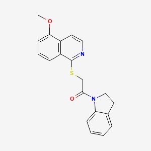 The mechanism of action of 1-(Indolin-1-yl)-2-((5-methoxyisoquinolin-1-yl)thio)ethanone involves its interaction with molecular targets such as enzymes and receptors. The indoline and methoxyisoquinoline moieties can bind to active sites, modulating the activity of the target proteins. The thioether linkage may also play a role in stabilizing the compound’s conformation, enhancing its binding affinity.