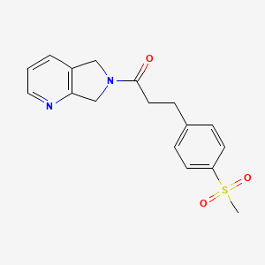 This compound features a pyrrolo[3,4-b]pyridine core fused with a propan-1-one moiety and a 4-(methylsulfonyl)phenyl substituent. The pyrrolopyridine scaffold is a bicyclic heterocycle known for its role in medicinal chemistry due to its structural resemblance to purine bases, enabling interactions with biological targets like kinases or enzymes . The methylsulfonyl group enhances solubility and metabolic stability, while the ketone linker provides conformational flexibility for target binding.