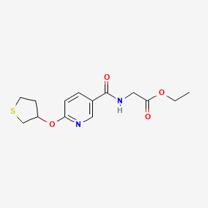 The synthesis of Ethyl 2-(6-((tetrahydrothiophen-3-yl)oxy)nicotinamido)acetate typically involves multi-step organic reactions, which may include esterification, amide formation, and etherification. One common synthetic route could start with nicotinic acid, which undergoes esterification with ethanol to form ethyl nicotinate. This intermediate might then react with tetrahydrothiophenol under specific conditions to introduce the tetrahydrothiophen-3-yl ether moiety.