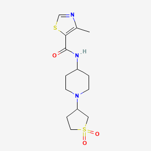 N-(1-(1,1-Dioxidotetrahydrothiophen-3-yl)piperidin-4-yl)-4-methylthiazole-5-carboxamide is a heterocyclic compound featuring a thiazole core substituted with a methyl group at position 4 and a carboxamide moiety at position 3. The carboxamide nitrogen is further linked to a piperidin-4-yl group, which is substituted at position 1 with a 1,1-dioxidotetrahydrothiophen-3-yl ring. This structure combines a sulfone-containing tetrahydrothiophene (sultam) with a piperidine-thiazole framework, which may confer unique physicochemical and pharmacological properties.